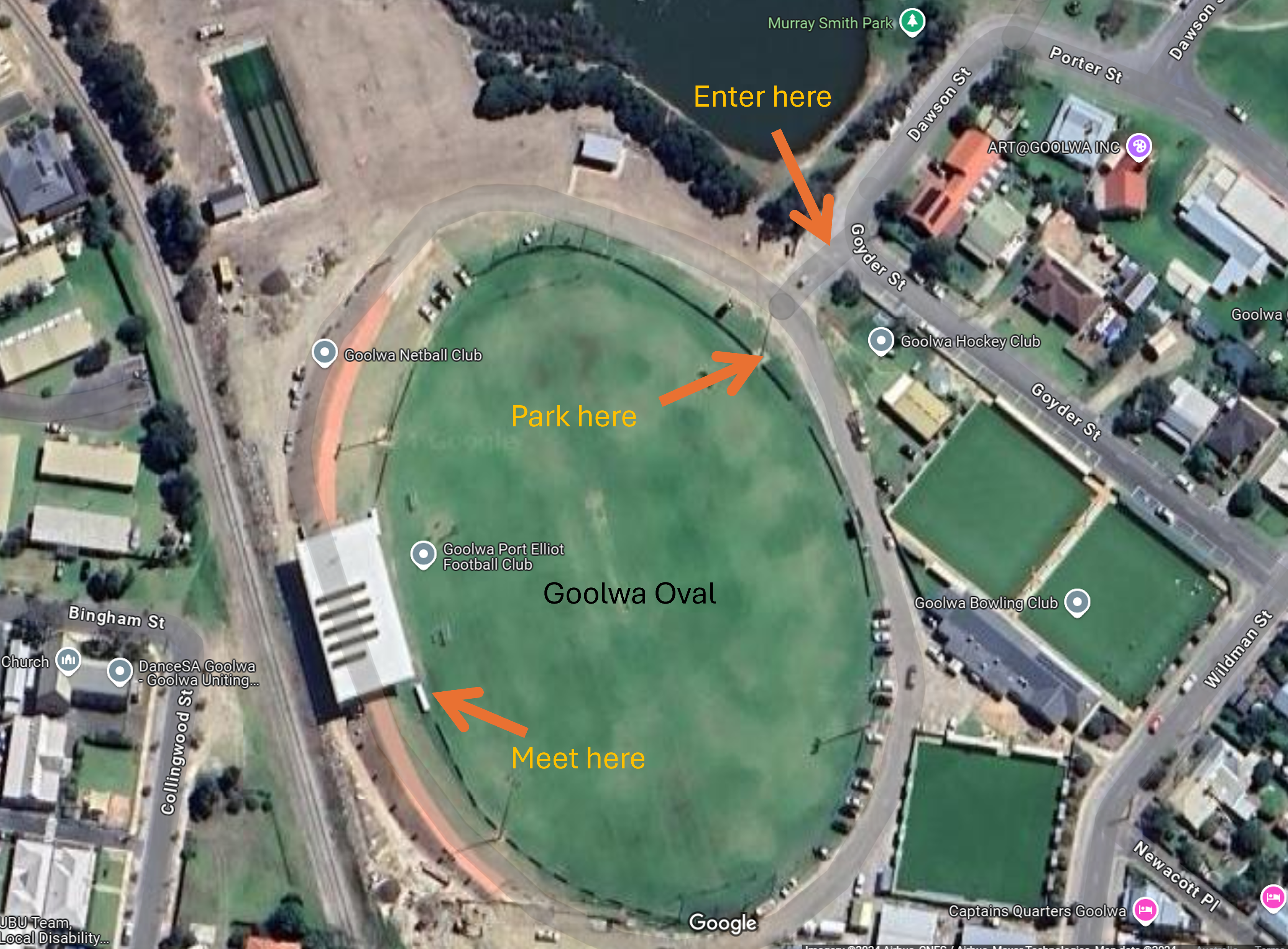 We meet to play on the Goolwa Oval. Entry to the oval precinct is at the corner of Dawson and Goyder Streets. Parking is indicated on the map, along with the location at which we meet.